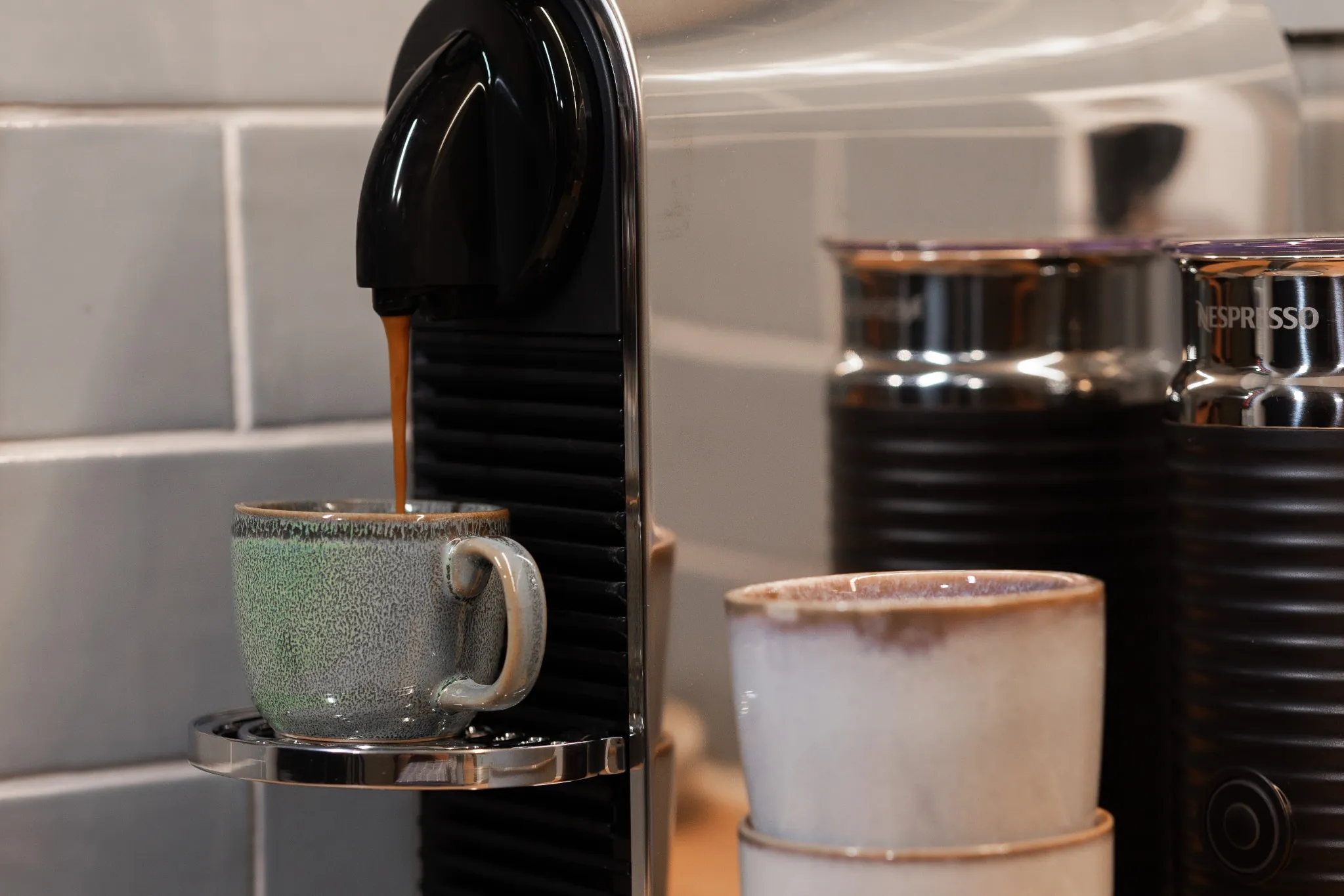 Gebruik van koffie, thee en water is bij de prijs inbegrepen. De pantry is voorzien van een Nespresso apparaat met diverse soorten koffiecups en een groot assortiment Clipper thee. De gebruikte kopjes en glazen kunnen na afloop in de vaatwasser worden geplaatst. In de hal is een toilet. Er wordt dagelijks schoongemaakt.
